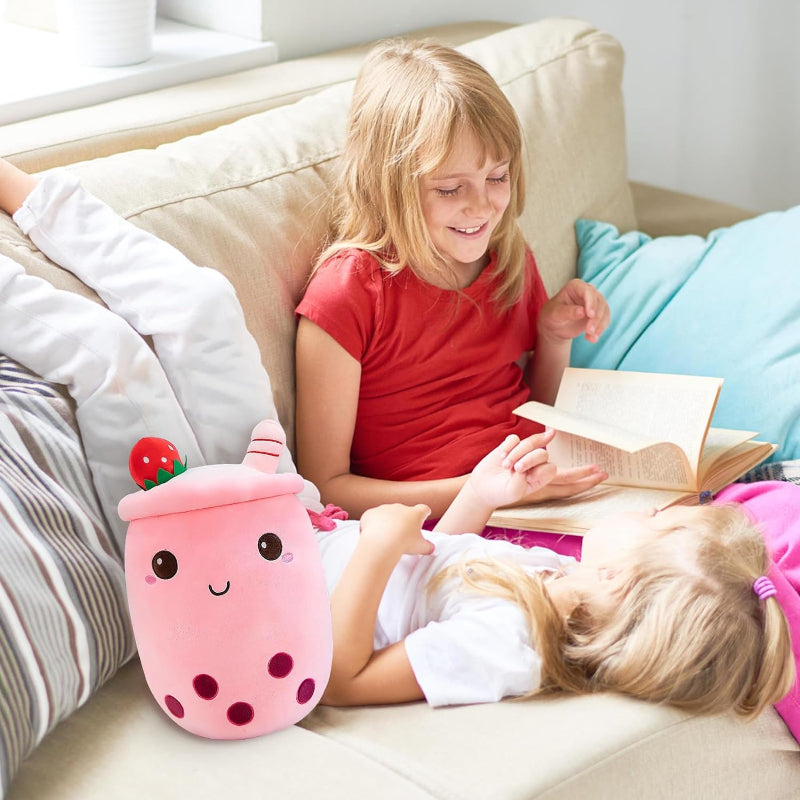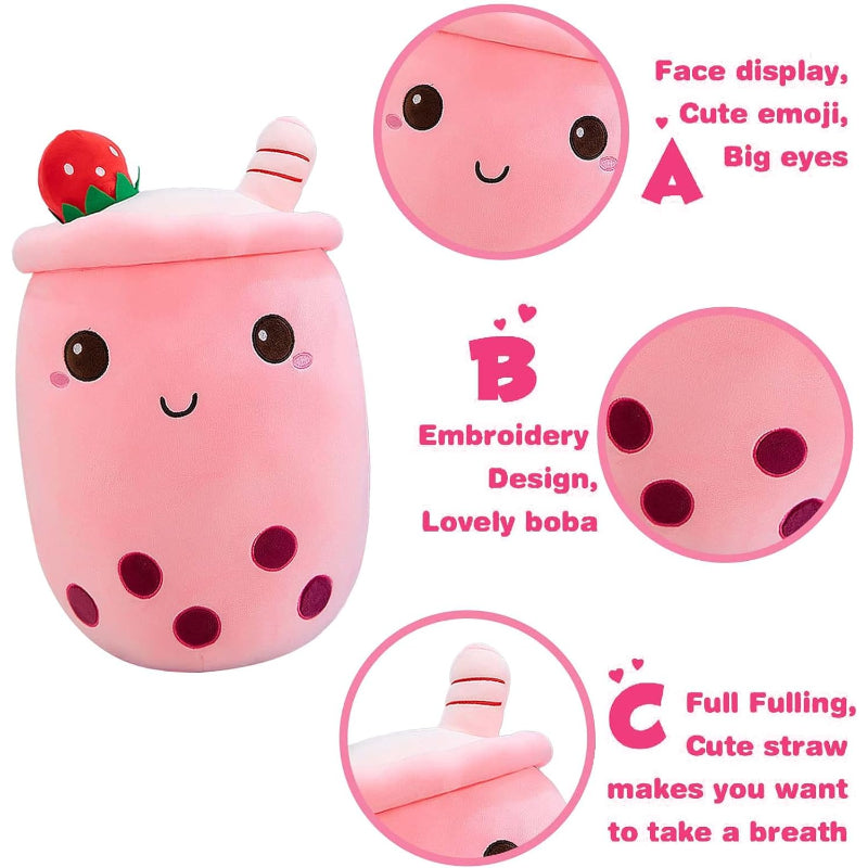 ?Indulge in the sweet comfort of the Strawberry Milk Cup Plush Pillow, a treat for any room. This plush pillow exudes charm with its soft pink fabric, reminiscent of strawberry milk, and is topped with a whimsical strawberry accessory for an authentic look. Its embroidered?profile?adds a dash of cuteness!