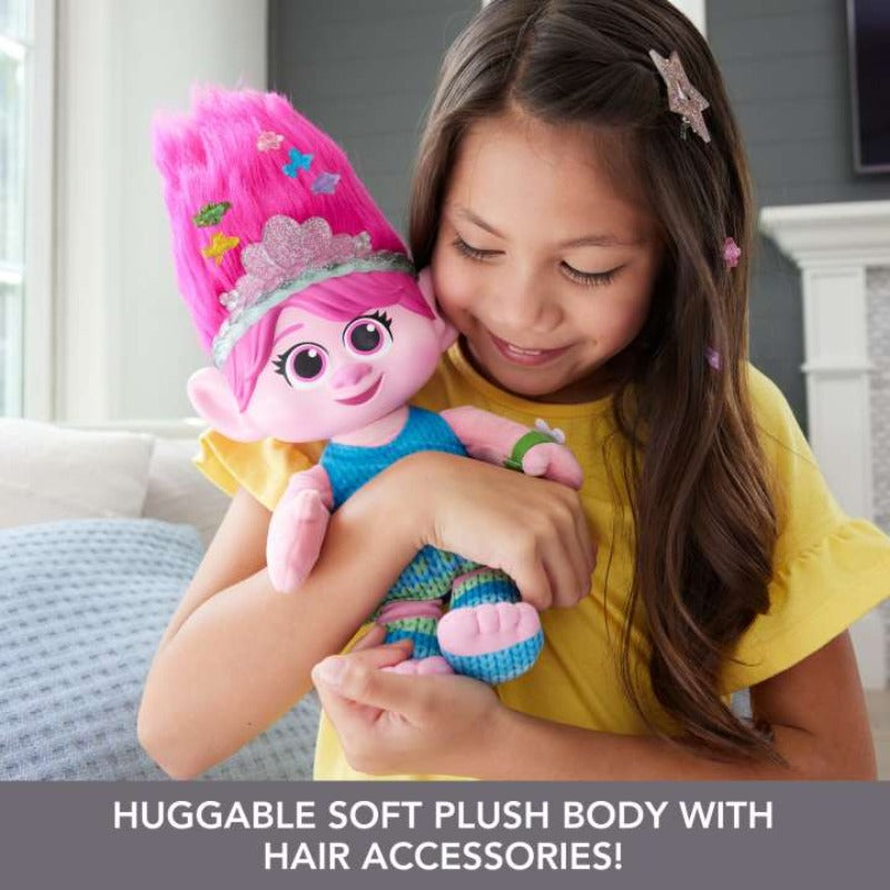 - Enjoy the magic with Queen Poppy plush - simply squeeze her hand to bring her to life with light and sound!