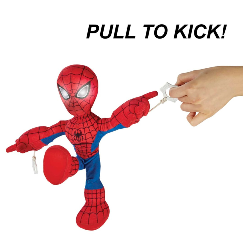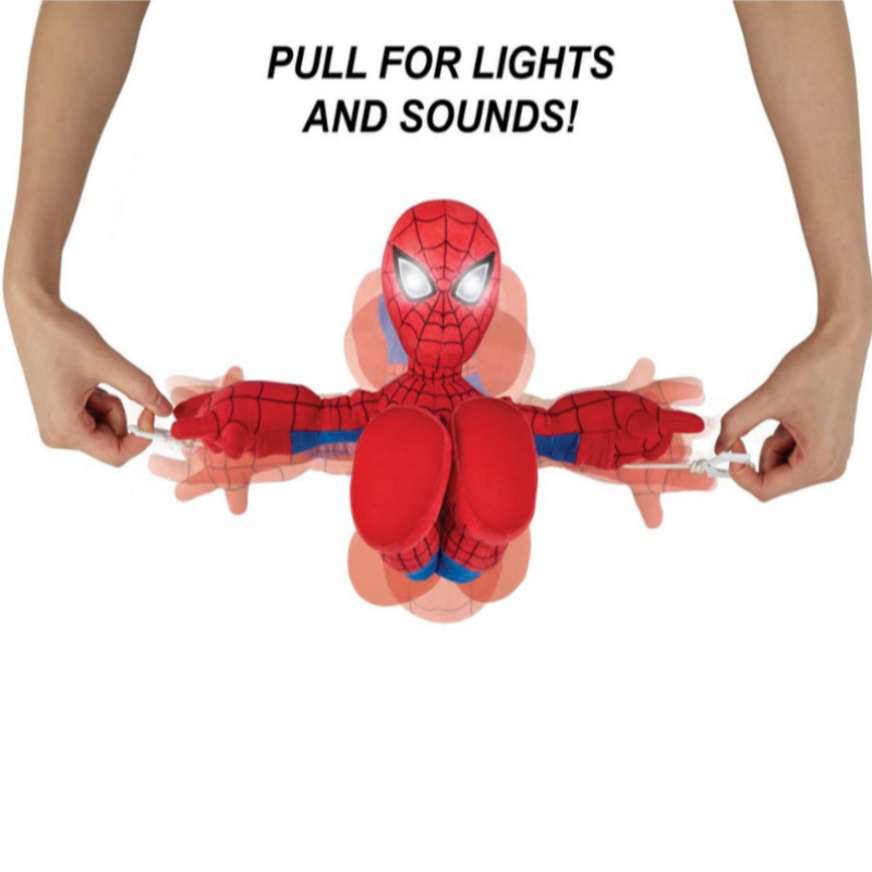 - When you pull the rope with one hand, the plush Super Hero figure will kick his other foot in a traditional web-swinging motion.