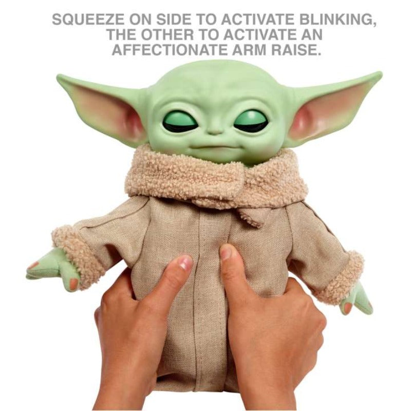 - Simply give Grogu's plush form a gentle squeeze on one side to witness his eyes blinking and hear realistic, soft vocal sounds.