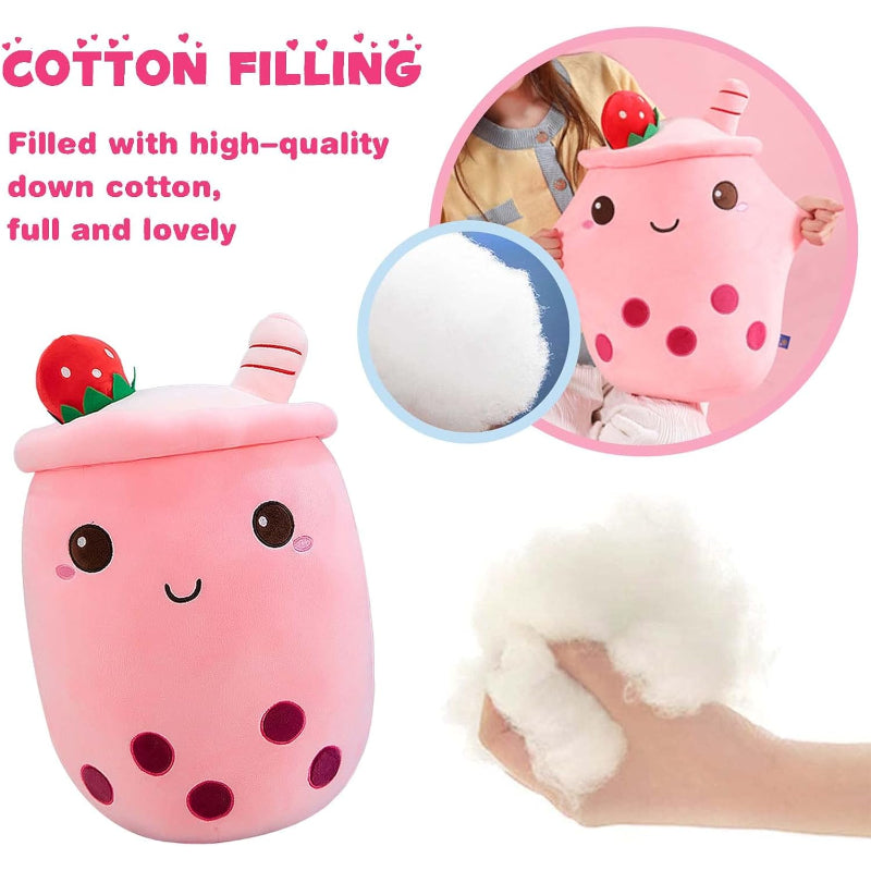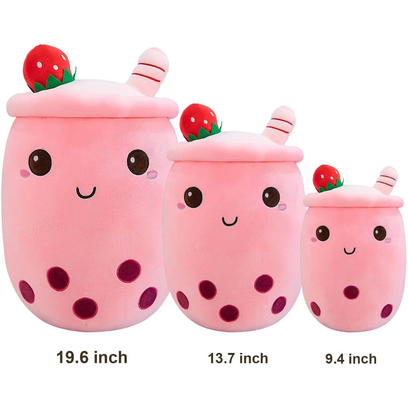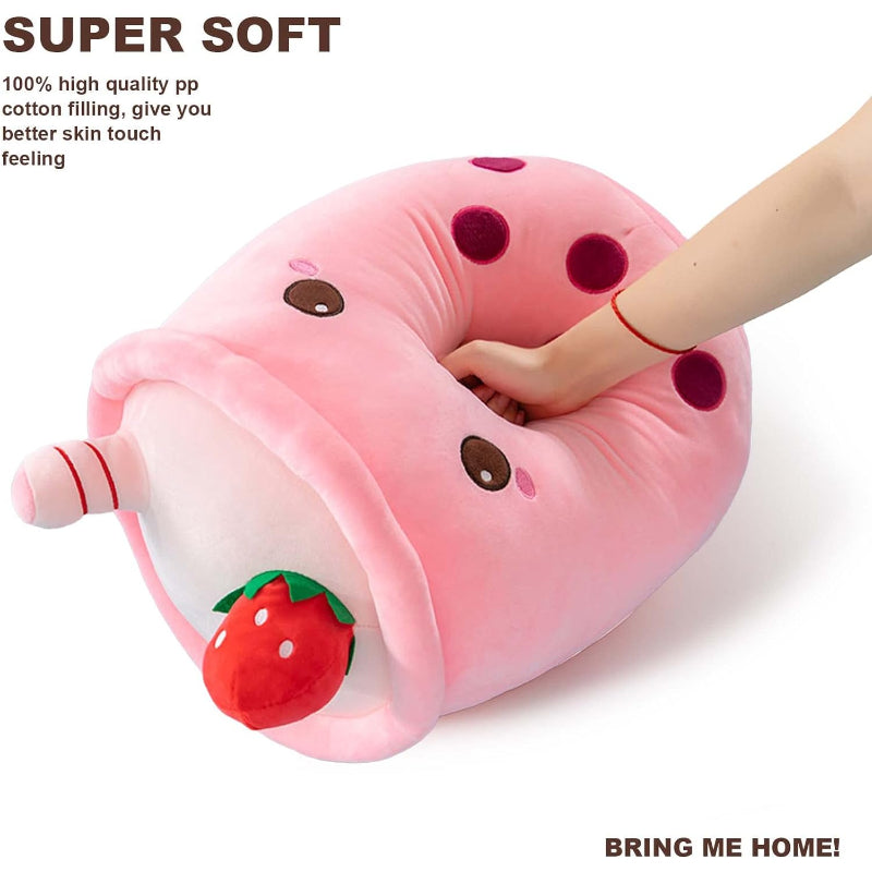 ?Indulge in the sweet comfort of the Strawberry Milk Cup Plush Pillow, a treat for any room. This plush pillow exudes charm with its soft pink fabric, reminiscent of strawberry milk, and is topped with a whimsical strawberry accessory for an authentic look. Its embroidered?profile?adds a dash of cuteness!