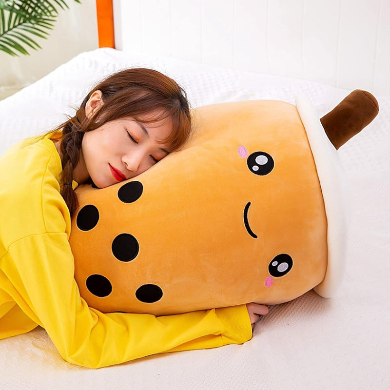 ?Meet this joyful Bubble Tea Plushie Pillow, the perfect companion to sweeten your day. Its rich, caramel-colored base is dotted with plush "pearls," and it's topped with a soft, white cream cap and a brown plush straw, creating a bubble tea look. Crafted from soft material, it's designed for both playtime!