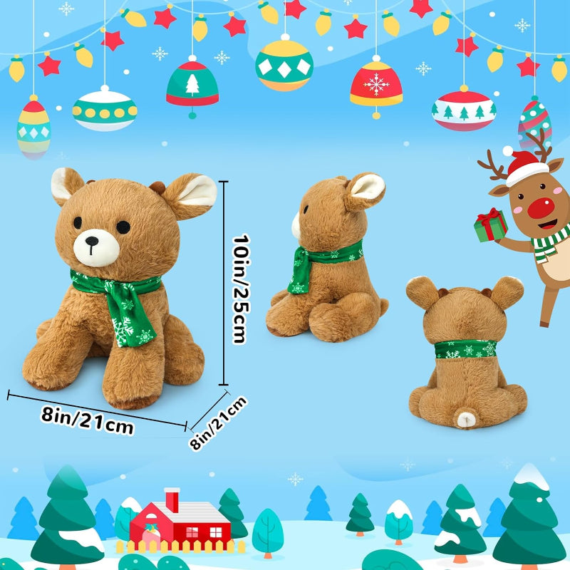 ?Get ready to embrace the holiday spirit with our Christmas Reindeer Plush Pillow! This charming plush toy is designed to look like a friendly reindeer, complete with a soft brown coat, white facial features, and an adorable green scarf adorned with snowflake patterns. Perfect for holiday gifting or decorating!