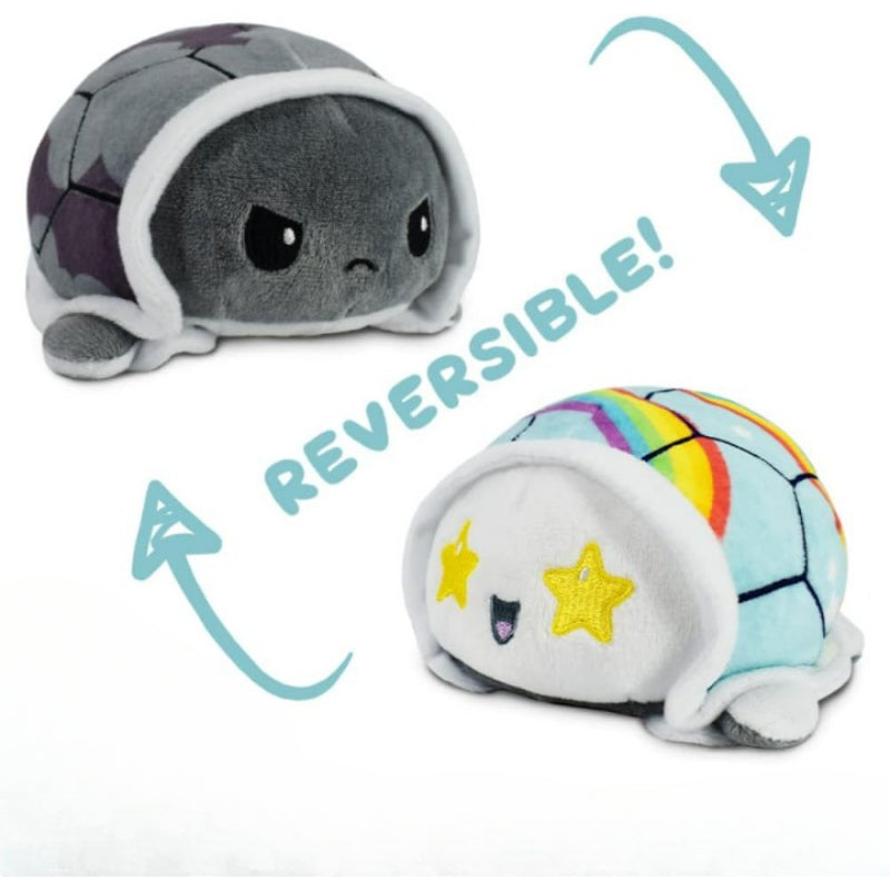 Experience the enchanting transition from day to night with the Reversible Designed Turtle Plush Toy. This adorable plush toy features a unique reversible shell that allows you to flip between two different colors. One side displays a deep, contemplative frown set against a starry night shell, while a simple flip reveals a different expression on a soft grey canvas. This plush is perfect for sharing your perspective.Product Features:- Reversible Magic: Enjoy two plush toys in one with a unique shell design that flips inside out to reveal a new stand and color theme.
