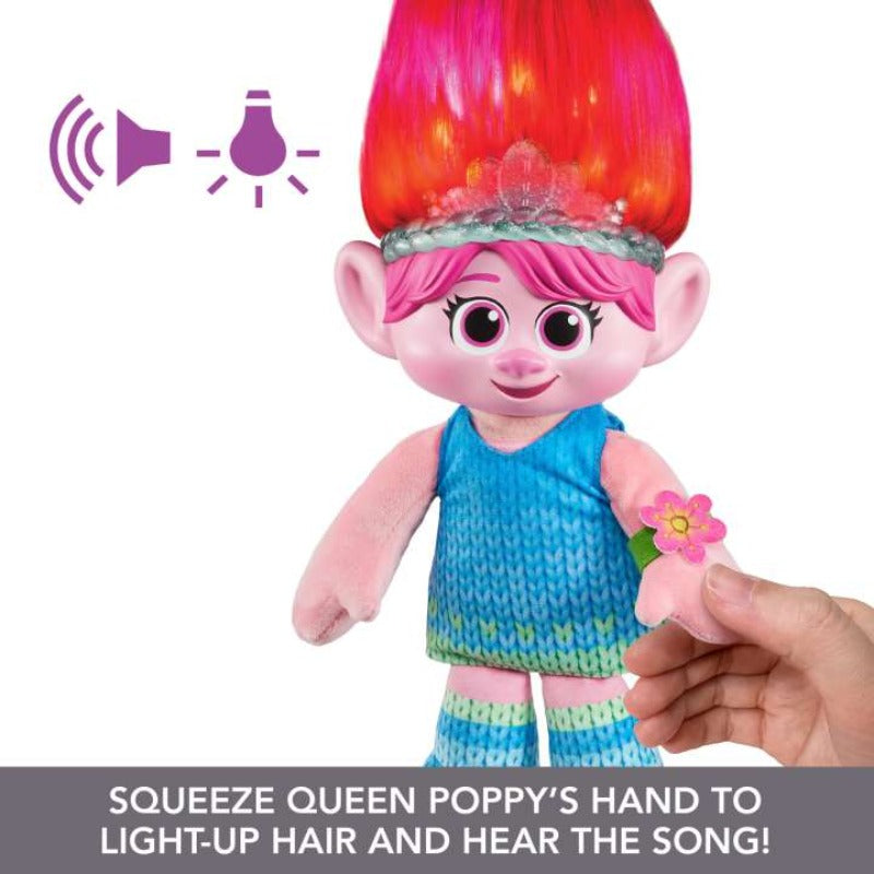 - Enjoy the magic with Queen Poppy plush - simply squeeze her hand to bring her to life with light and sound!