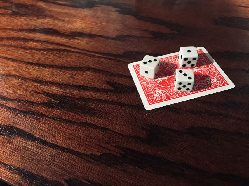 A playing card is selected, returned to the deck, and the cards are shuffled. The participant is then given the dice and they're instructed to take them far away from the group and mix them at random. They confirm that the dice generate random numbers. They're asked to mix the dice once more, but they're instructed to not look at the numbers.