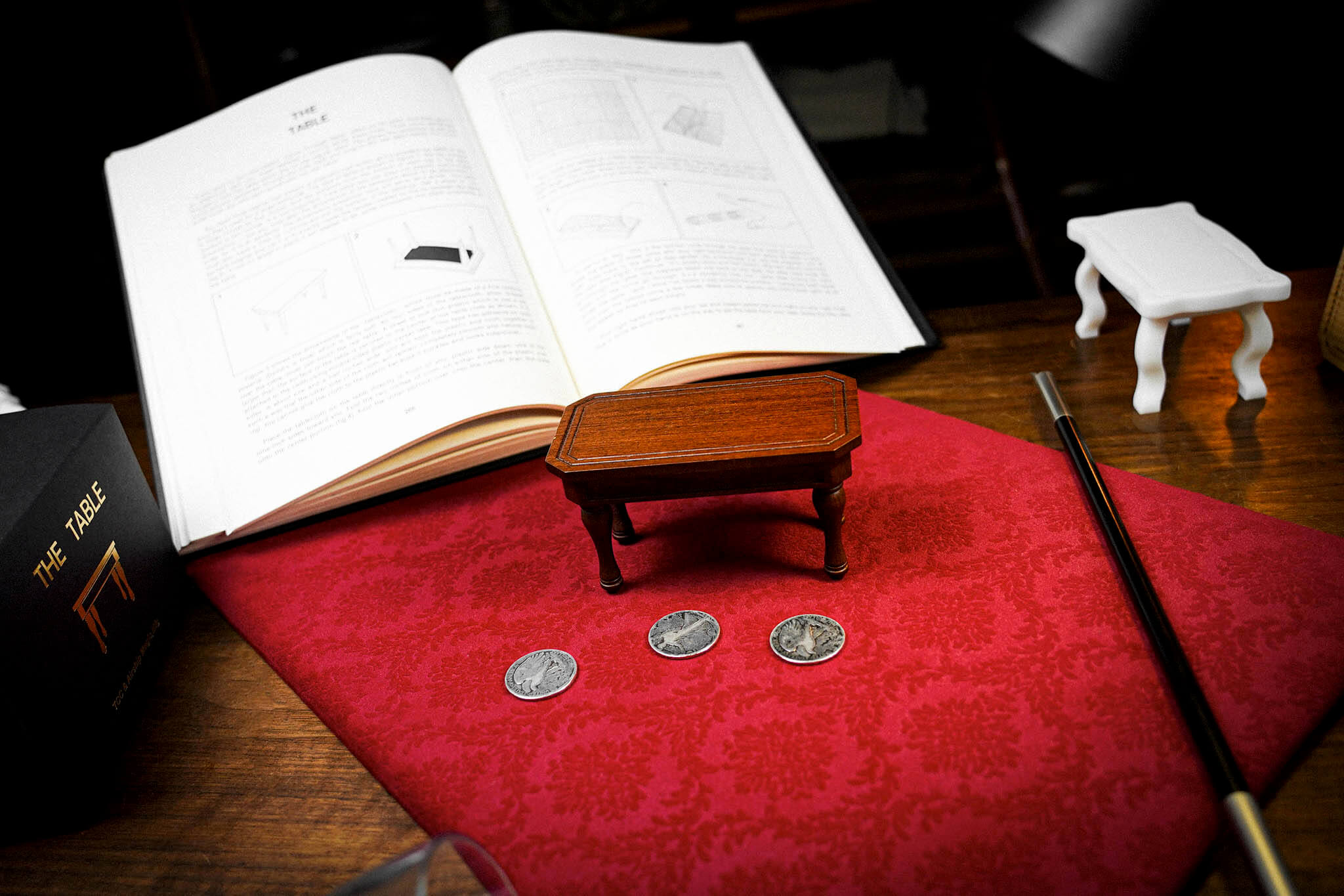You show a small ornate wooden table that can be handed out for examination. You then introduce 4 half dollars and one by one cause the coins to visibly penetrate the table with no cover. At the end of the performance, you drape black silk over the table and with a gentle press cause the table to penetrate the working surface or vanish entirely.