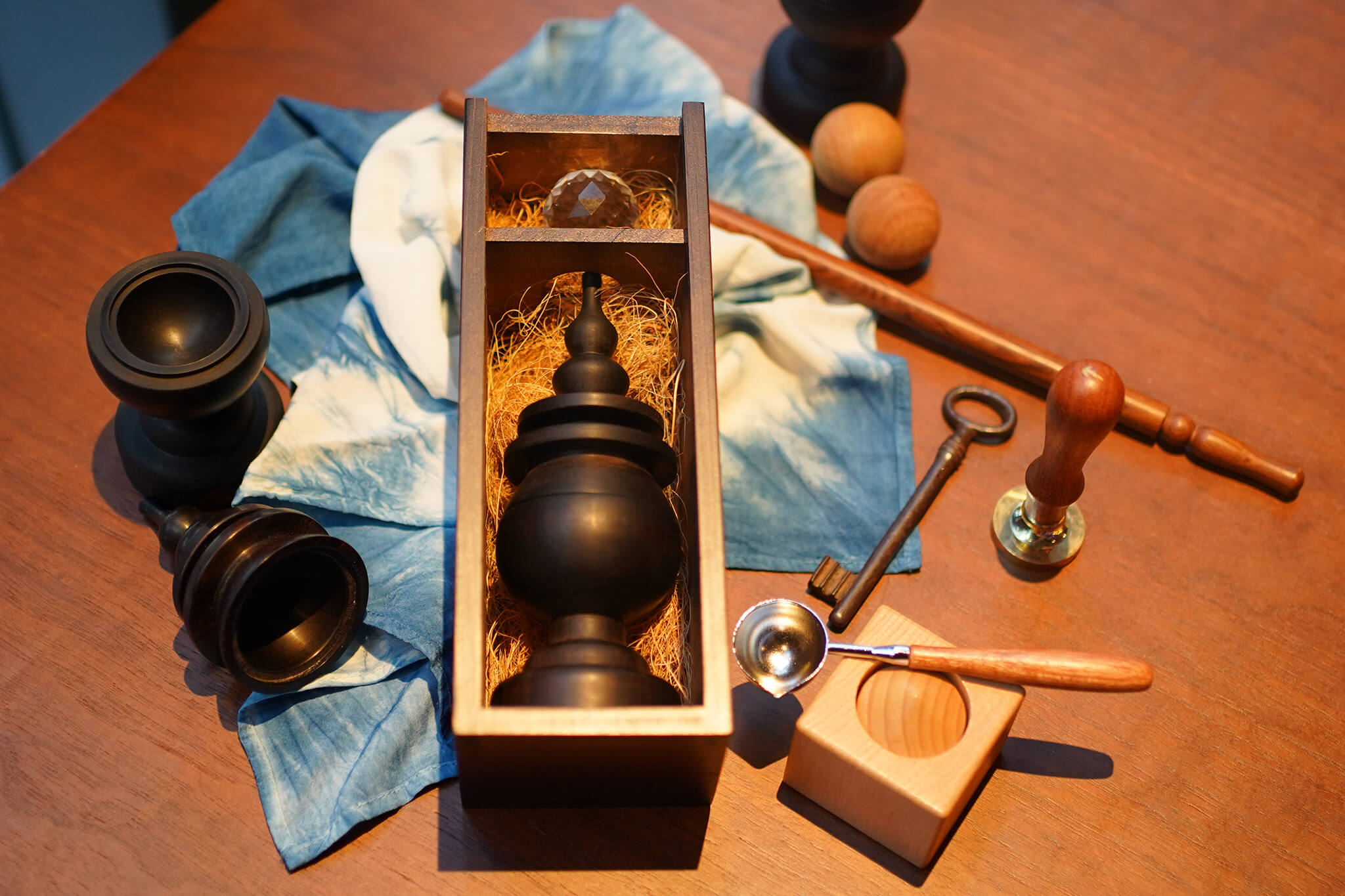 An exclusive custom solid wood display box with a clear sliding lid will store the prop safely and can also be used as a display case on your shelf or magic corner.