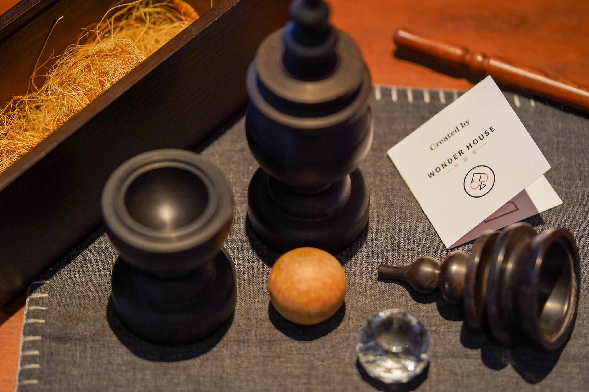 The vase was designed with reference to the stone pagodas and is made of Mufunjo Wood. The dark color gives off an antique, imposing, yet calm vibe. The weight of solid wood prevents tilts and unwanted shifts, allowing for a comfortable and smooth performance.